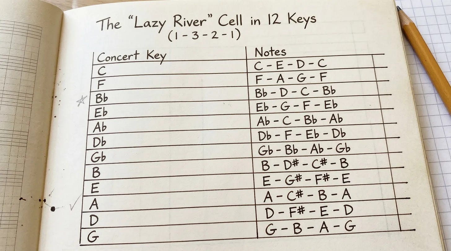 Start with four notes; some people might call them a “cell.” Just playing those first four notes in all keys is a pleasant exercise. Again. “Lazy River”… Again. “Lazy River.” Again. Just do not do this with company in the house. “Lazy River.”