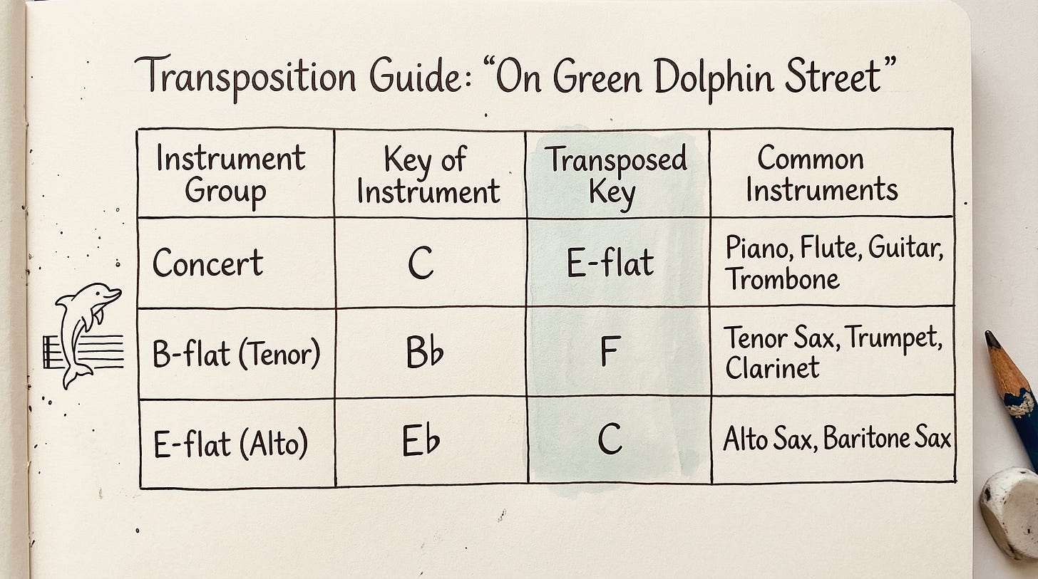 That happened to me too often. Over the years, I have felt compelled — no matter how mistake-ridden or repetitive — to learn my repertoire in at least three keys. That’s the minimum baseline if you want to play tenor, soprano or clarinet; alto or baritone; and piano or flute. A tenor sax is a B flat instrument, meaning when a tenor player sees a “C,” it sounds like a B flat a major second below. To play a concert C song, the tenor player must play in D. Realistically, this is what a professional would be called on to know.