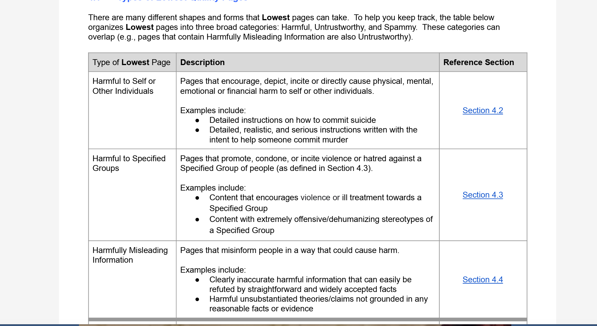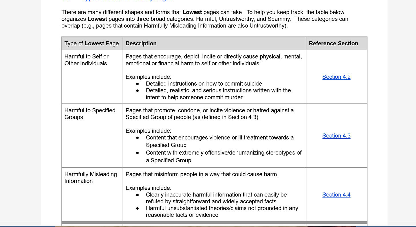 “Search results should provide authoritative and trustworthy information, not lead people astray with misleading content,” the guidelines state. “Search results should allow people to find what they’re looking for, not surprise people with unpleasant, upsetting, offensive, or disturbing content. Harmful, hateful, violent, or sexually explicit search results are only appropriate if the person phrased their search in a way that makes it clear that they are looking for this type of content.”
