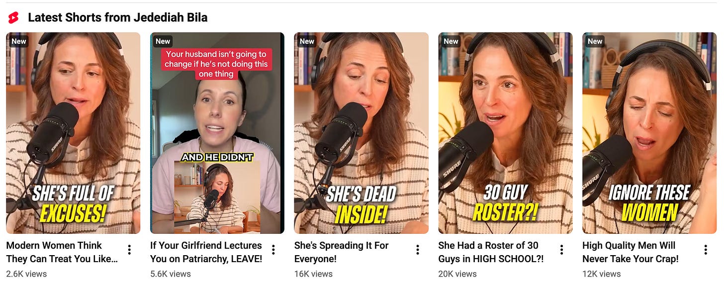 My own feed is a curated mix of jazz videos, chess games, and partisan political discourse. Every once in a while, the algorithm throws in something seemingly nonsensical. I find myself asking: Why am I being flooded with Jedediah Bila shorts? I never heard of her before. There are travel videos here and there, and a creator who claims to be “at the intersection of art and culture.” But again — why am I seeing so much Jedediah Bila?